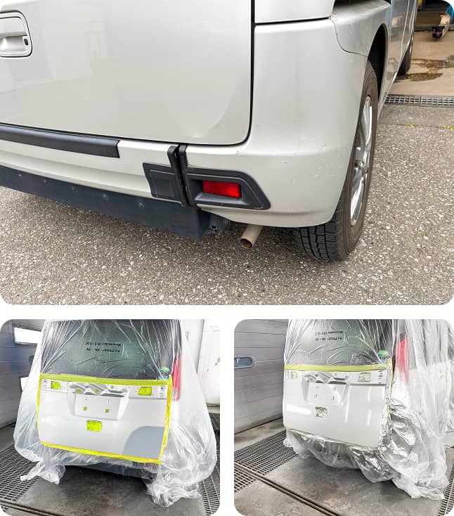 車両後部バックドアに損傷があり、キズと変形が