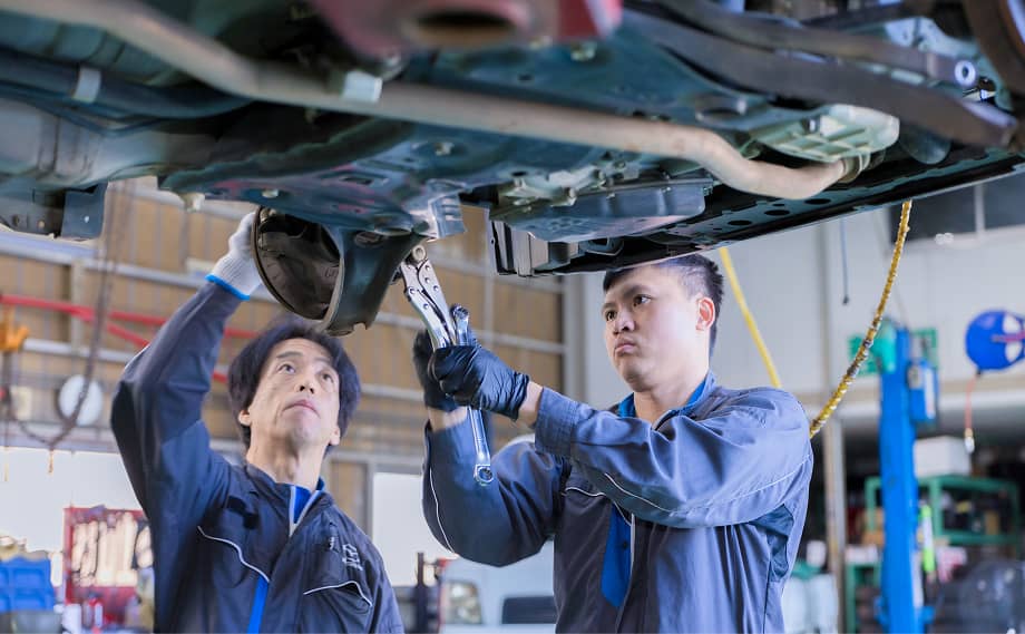 1台のクルマにプロの整備士3名が付いて整備・点検。丁寧で確実な作業で、お客様のクルマをしっかりとチェックします。
